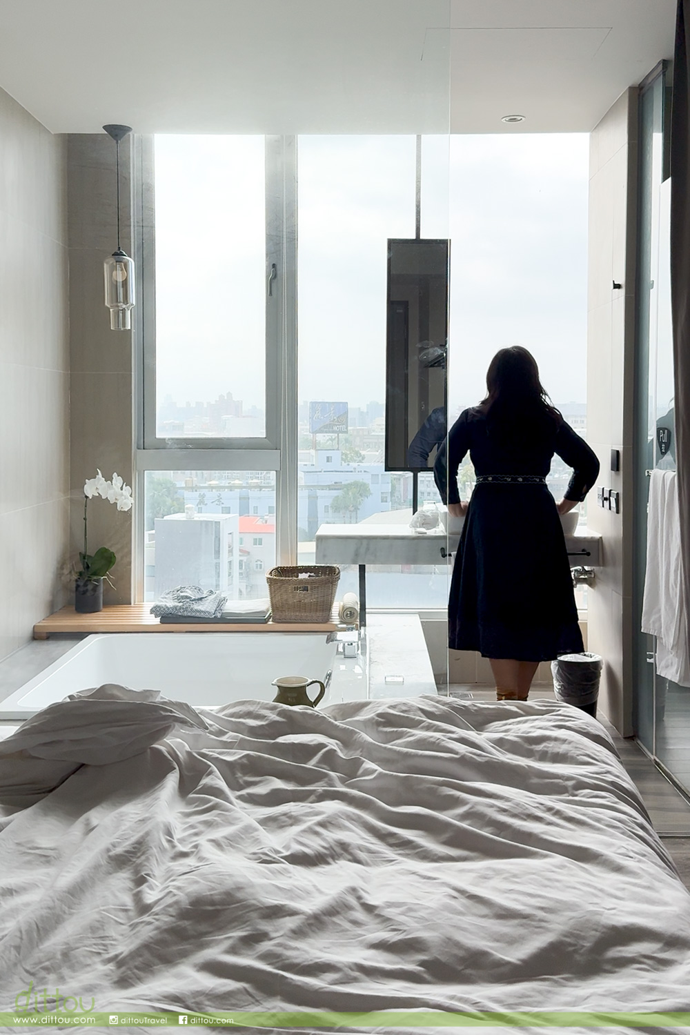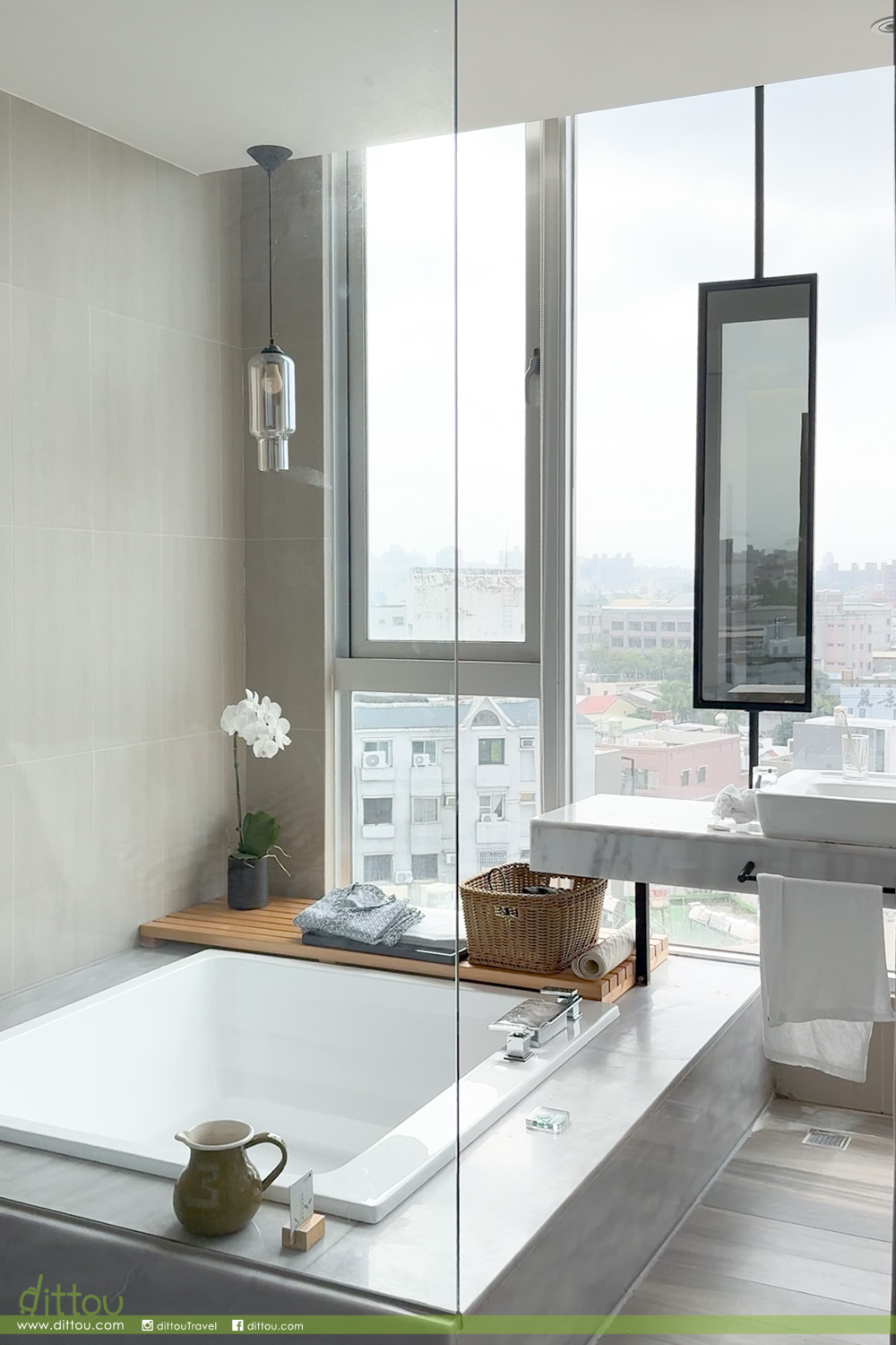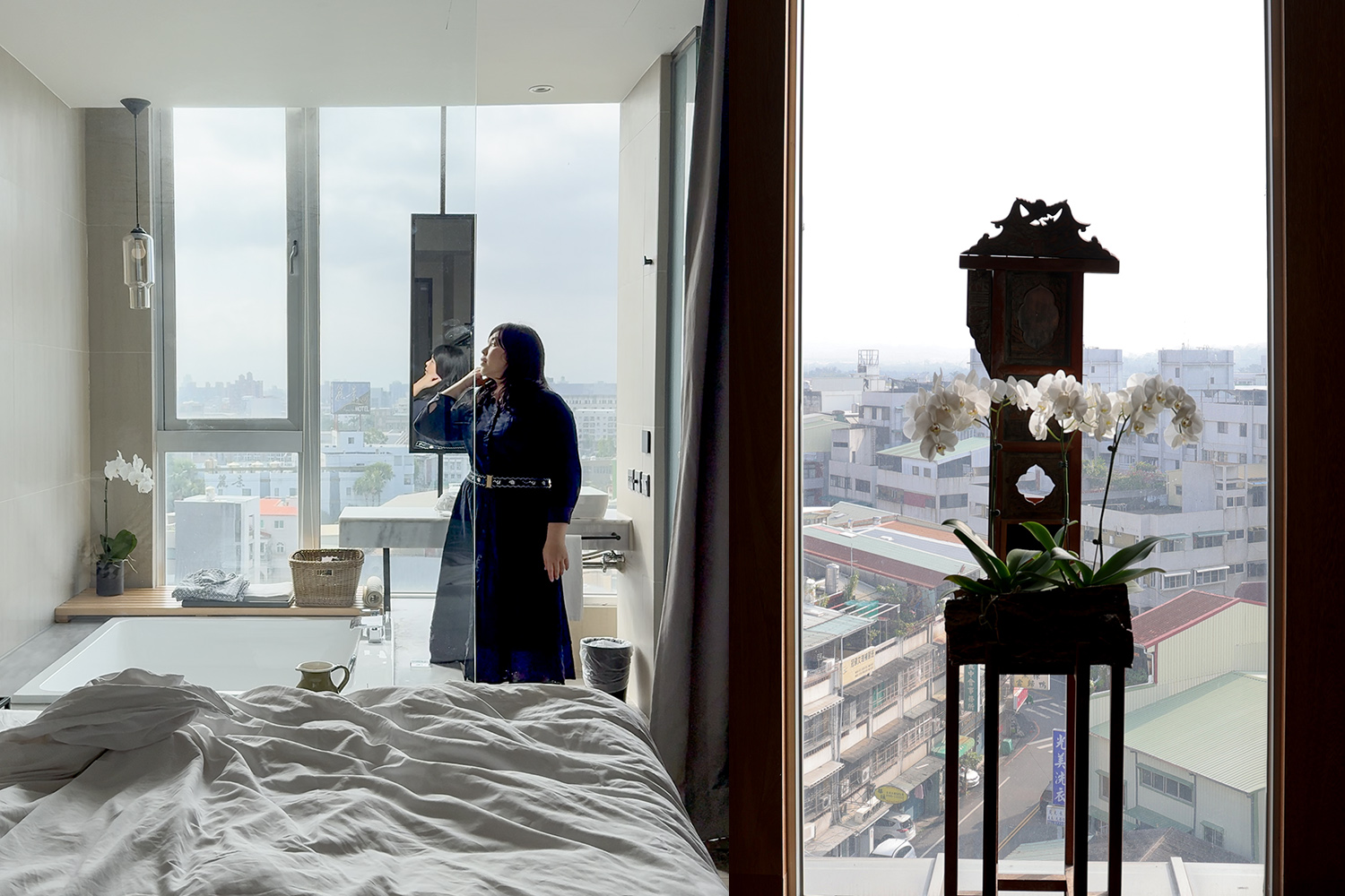 落地窗的設計,浴室與盥洗空間設於窗邊,洗漱時就透過落地玻璃感受到嘉義的陽光,也看到了來往的車子、趕路的行人,仿佛一起享受這城市的日常。