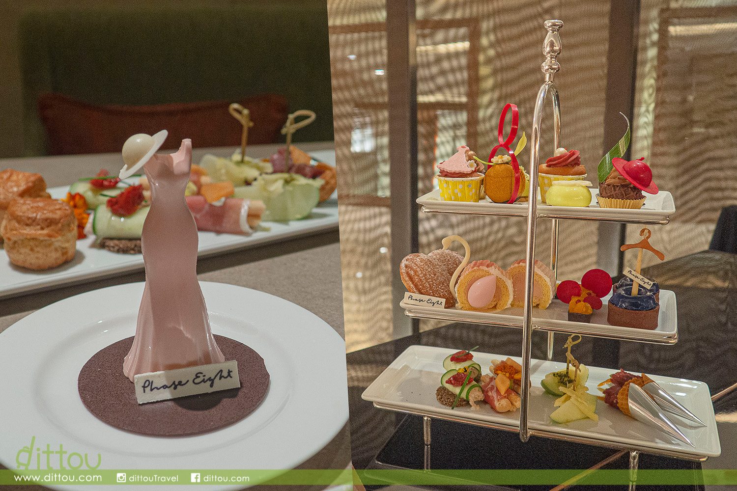 打開甜蜜的英式衣櫥吧!9款甜食和4款鹹點綴以別出心裁的時尚裝飾,當中焦糖海鹽馬卡龍的大型紅色「8」字,代表Phase Eight中的「Eight」,甜品師傅說這是相當有難度的設計,需花一點功夫才做到企身又好味的「8」字。而襯上粉紅連身裙的紅桑子杯子蛋糕內加入微酸的紅桑子忌廉,味道充滿層次驚喜。