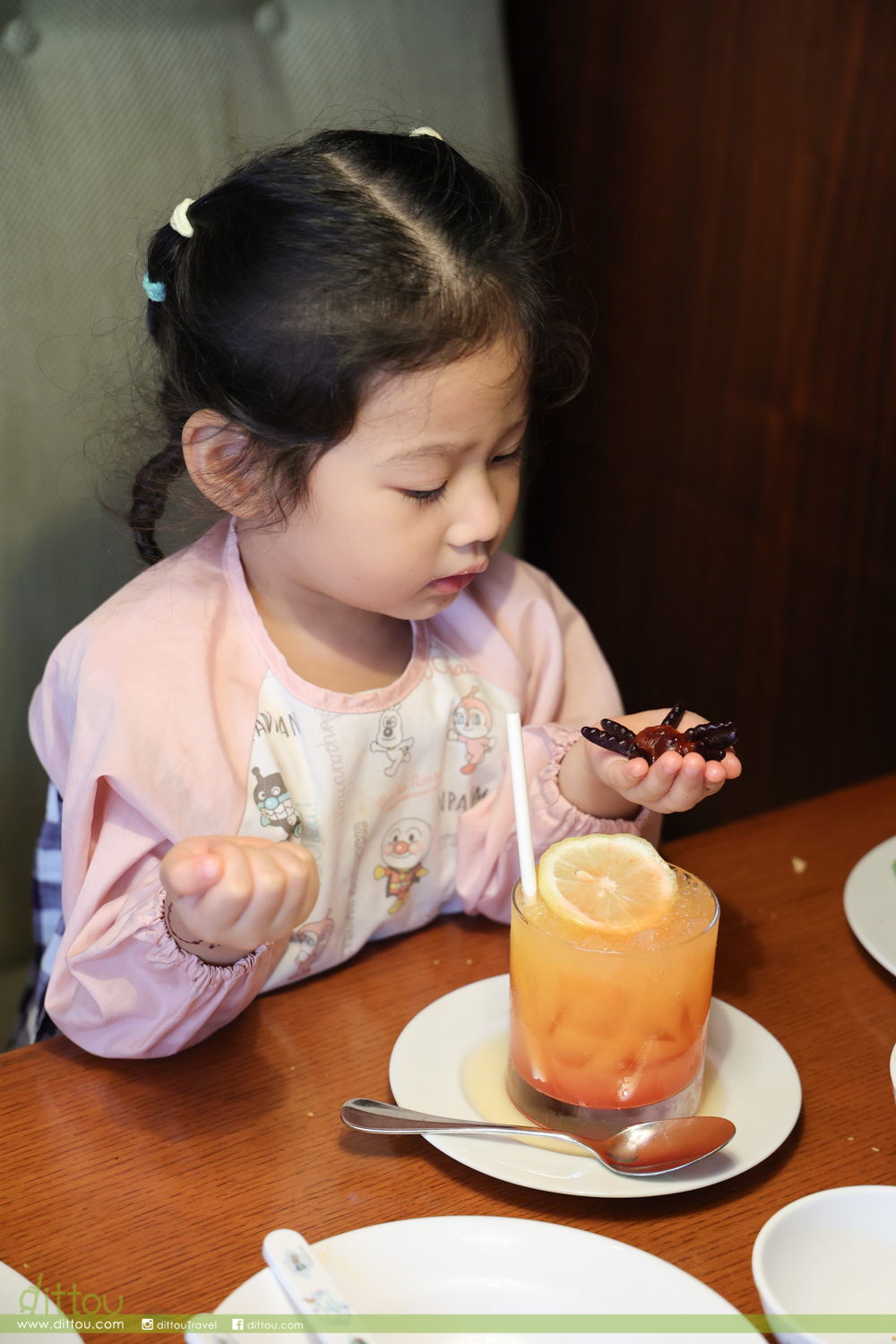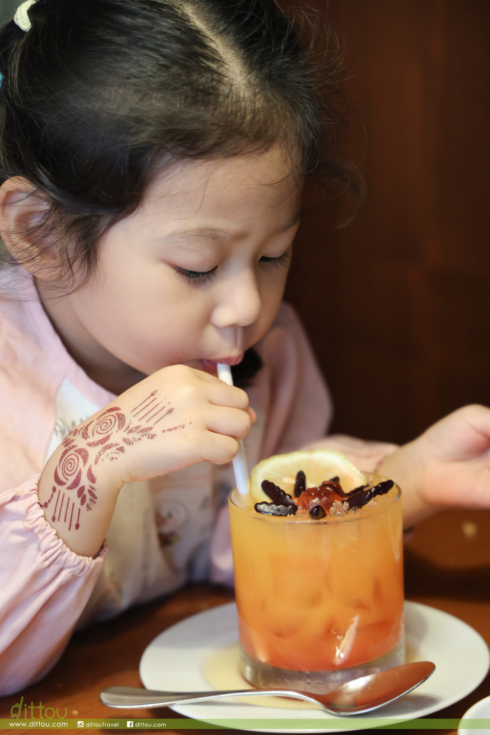 付費享用brunch的每位兒童,更會額外送上特製無酒精 fruit punch,寶寶又驚又想玩上面的 spider candy。