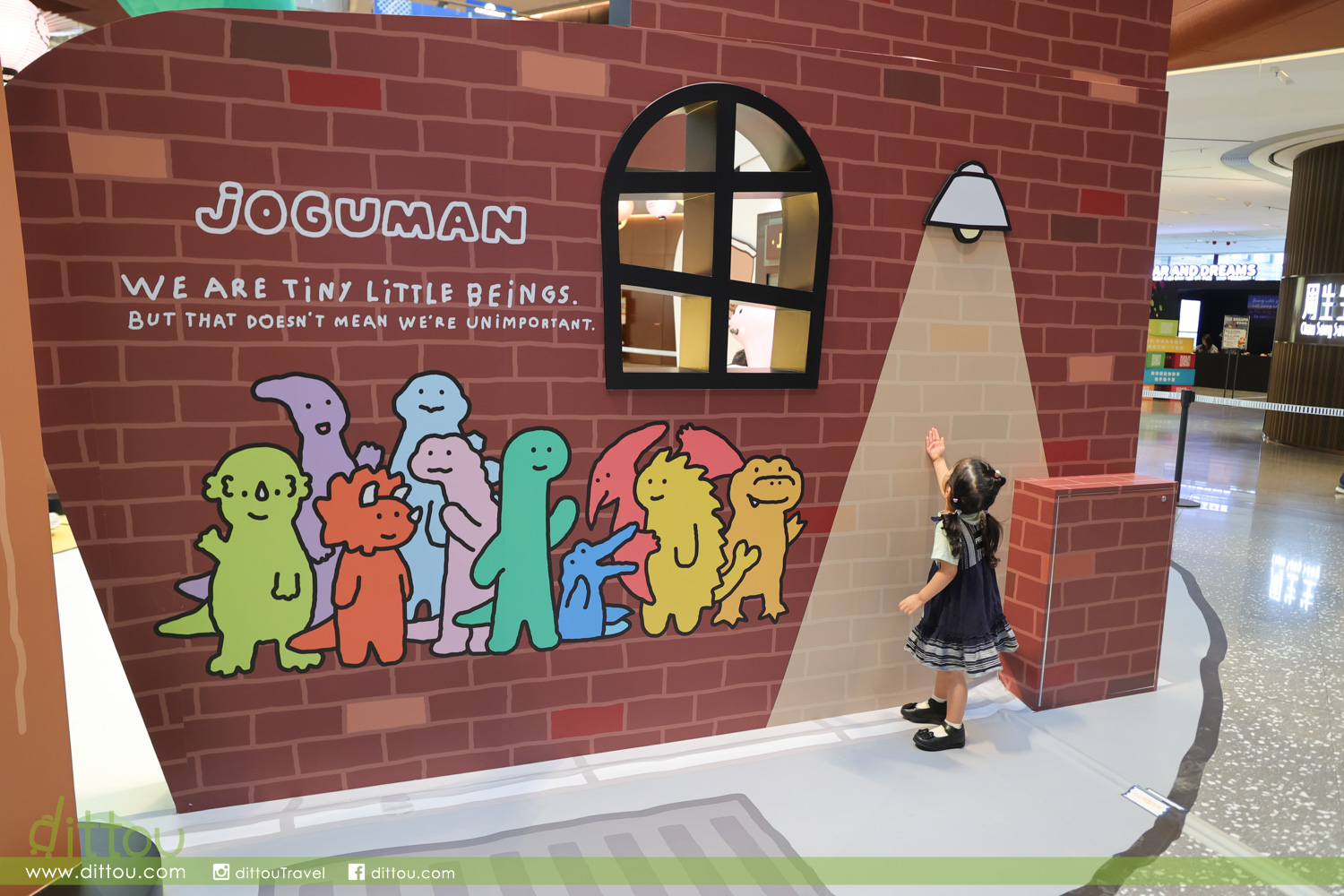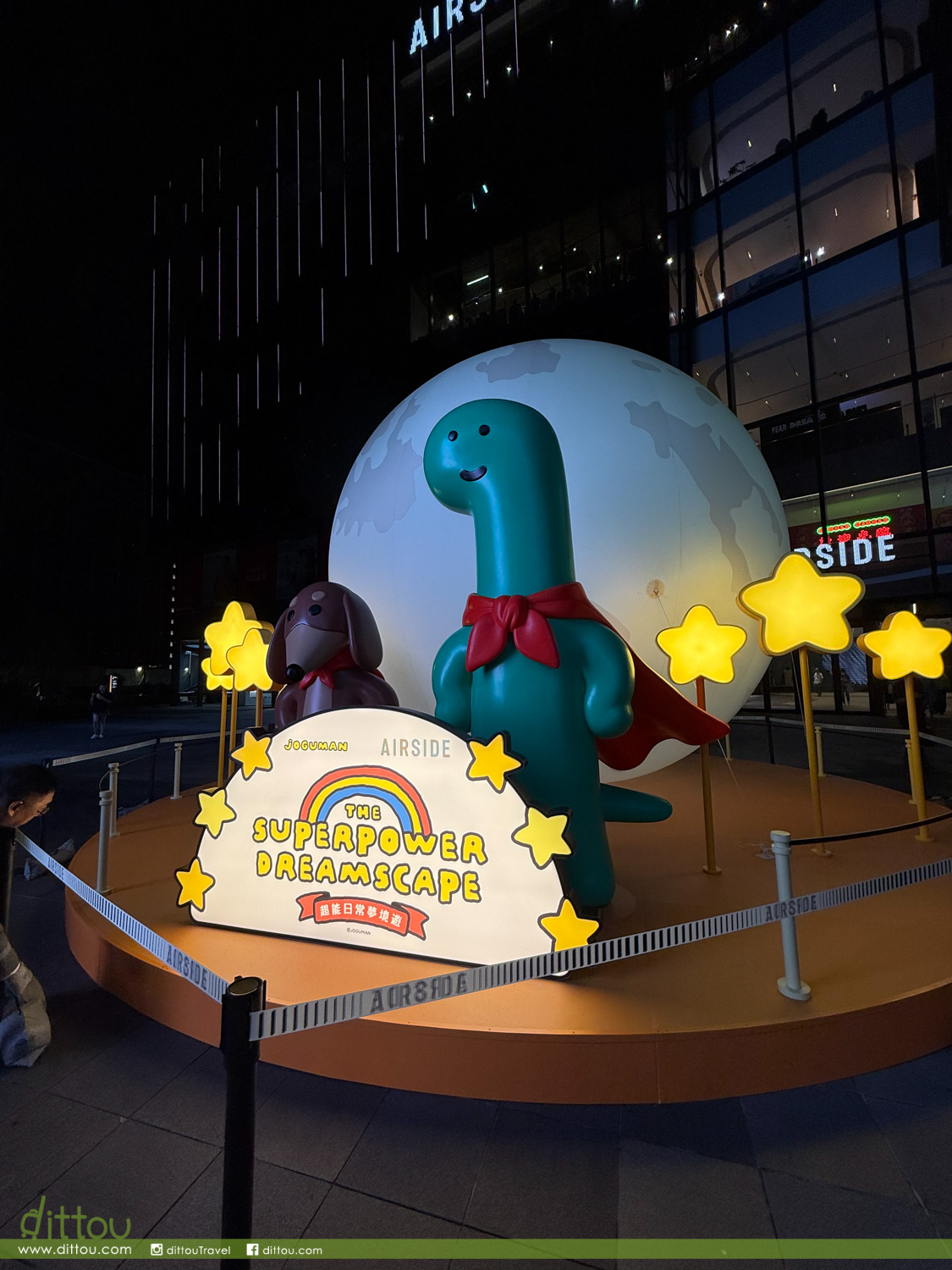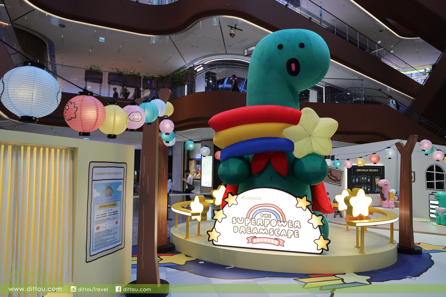 一眾 JOGUMAN 包括 BRACHIO(芭奇奧)、DIPLO(甸蒲露)、TRICERA(特莉奇娜)、ANKYLO(荌奇爐)、STEGO(蒔提哥)及BRACHIO(芭奇奧)的寵物狗 — WOODY(葫迪)等坐鎮 AIRSIDE 中庭,6米高「巨型 BRACHIO(芭奇奧)」超能恐龍穿著紅色斗篷,手捧流星讓大家向流星許願;旁邊設「白日夢想家專用車廂」與「JOGUMAN 超能充電站」讓你走進JOGUMAN夢境世界打卡。在車廂,擁有強烈健身慾望的 STEGO(蒔提哥)隨心拿起啞鈴做運動;回到家中, TRICERA(特莉奇娜)與熱愛啤酒的DIPLO(甸蒲露)已準備好與你舉杯暢飲、盡情享用爆谷、享受珍貴的宅宅時刻。感到疲倦時,不妨與BRACHIO(芭奇奧)一起放鬆身心發呆Do Nothing、 清空腦袋、恢復精力,為新的明天注入無限動力。