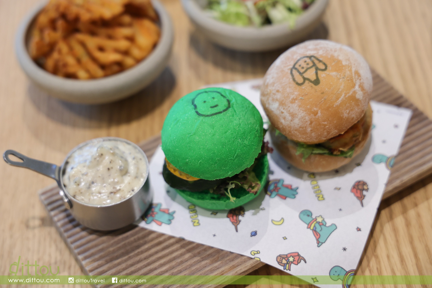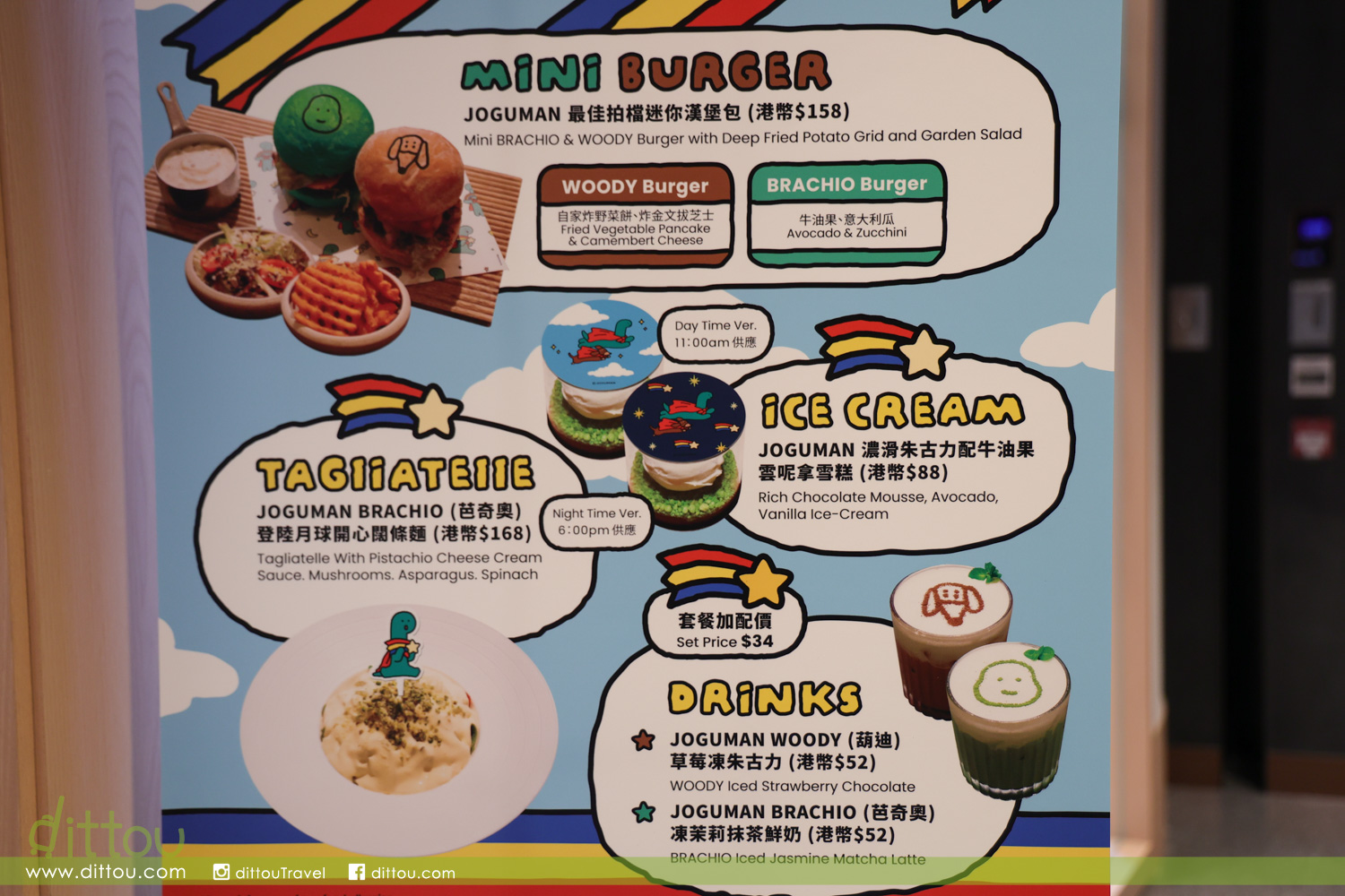 「JOGUMAN 最佳拍檔迷你漢堡包」(港幣158元),包括兩款JOGUMAN主題迷你漢堡包,印有BRACHIO(芭奇奧)頭像的 Burger由意大利青瓜與牛油果作餡料,而印有WOODY(葫迪)頭像的Burger由炸野菜餅及炸金文拔芝士製成,伴上新鮮沙律、脆辣薯格及松露醬。為同JOGUMAN一樣喜歡素食的朋友,可享用「JOGUMAN BRACHIO(芭奇奧)登陸月球開心闊條麵」(港幣168元),由開心果、奶油、野菌、蘆筍及菠菜烹調的闊條麵,加上以BRACHIO(芭奇奧)抱著流星登陸月球的可愛造型擺碟,與今次的活動主題相呼應。
