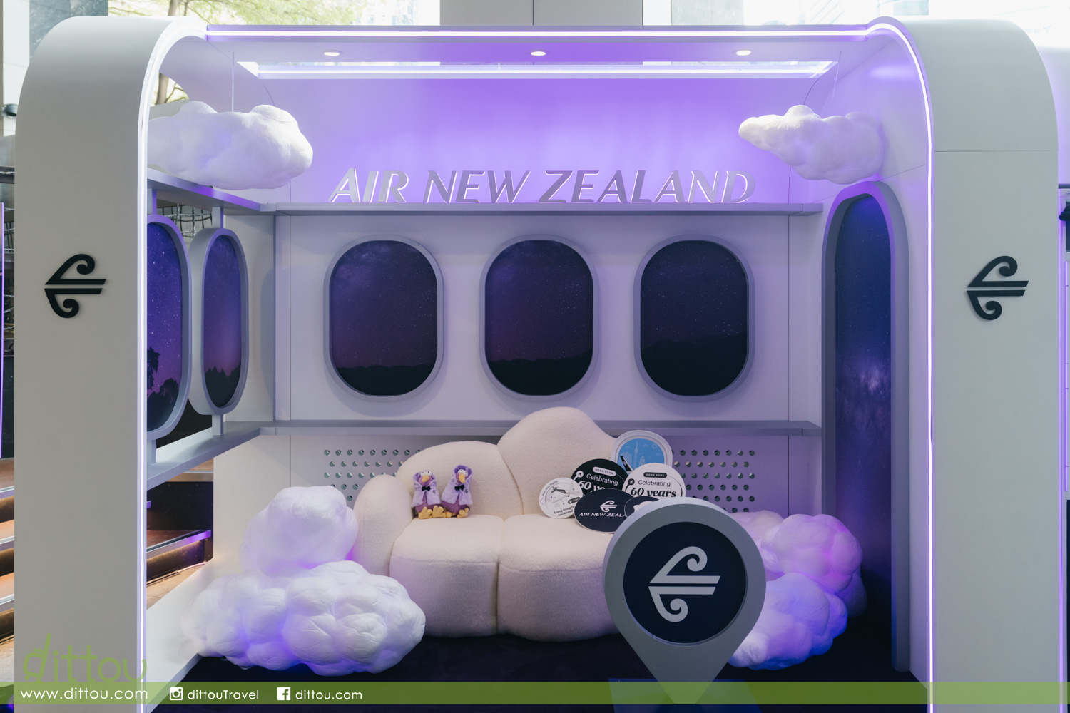 榮獲Airlineratings.com「全球最佳經濟艙」的空中梳化 Skycouch 的夢幻體驗區,以品牌標誌性紫色調打造主題機艙區,配以座椅布局、飛機窗及 Koru 標誌,營造,無論坐姿、側臥或平躺,皆可自由擺拍,每一角落皆為絕佳打卡點。