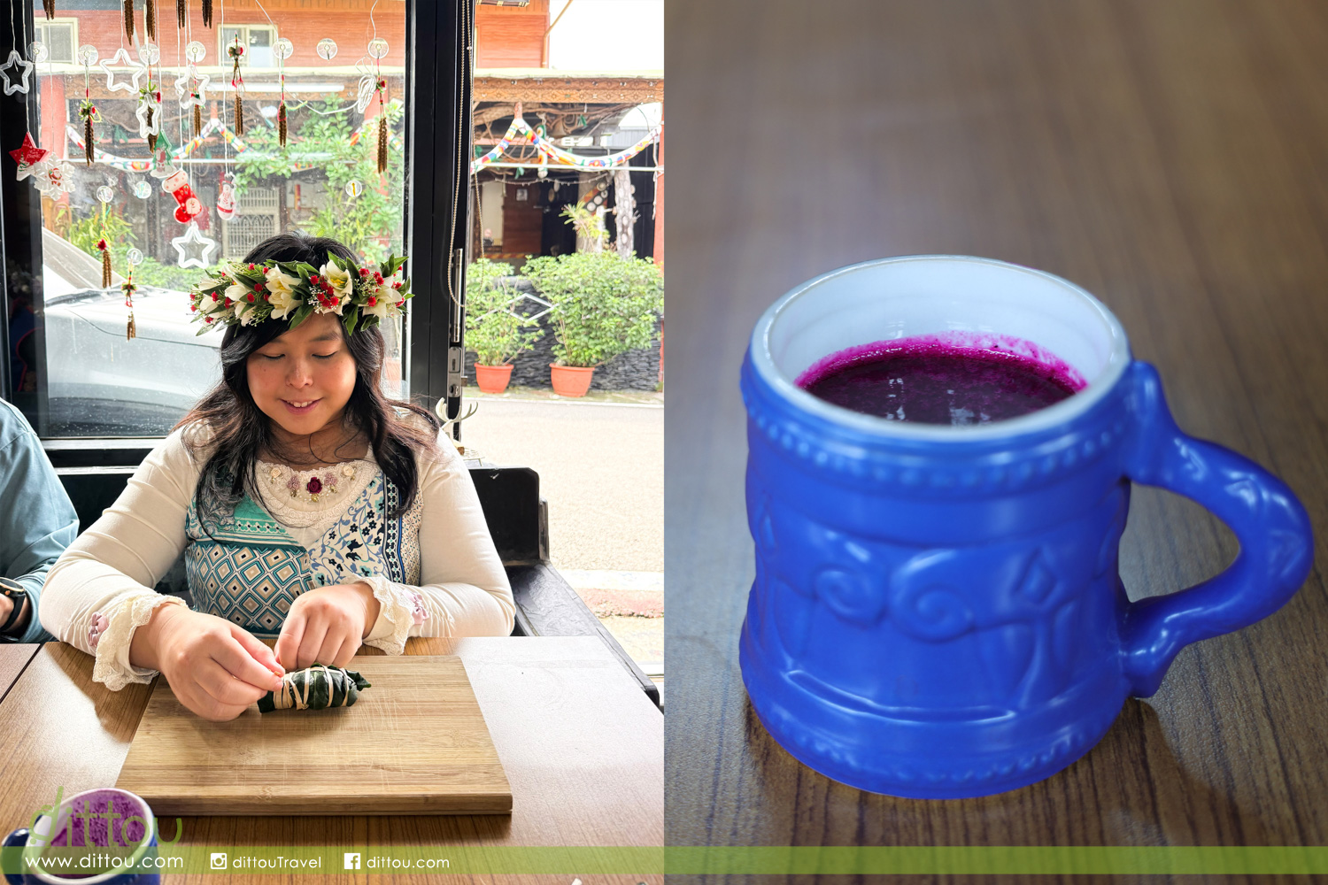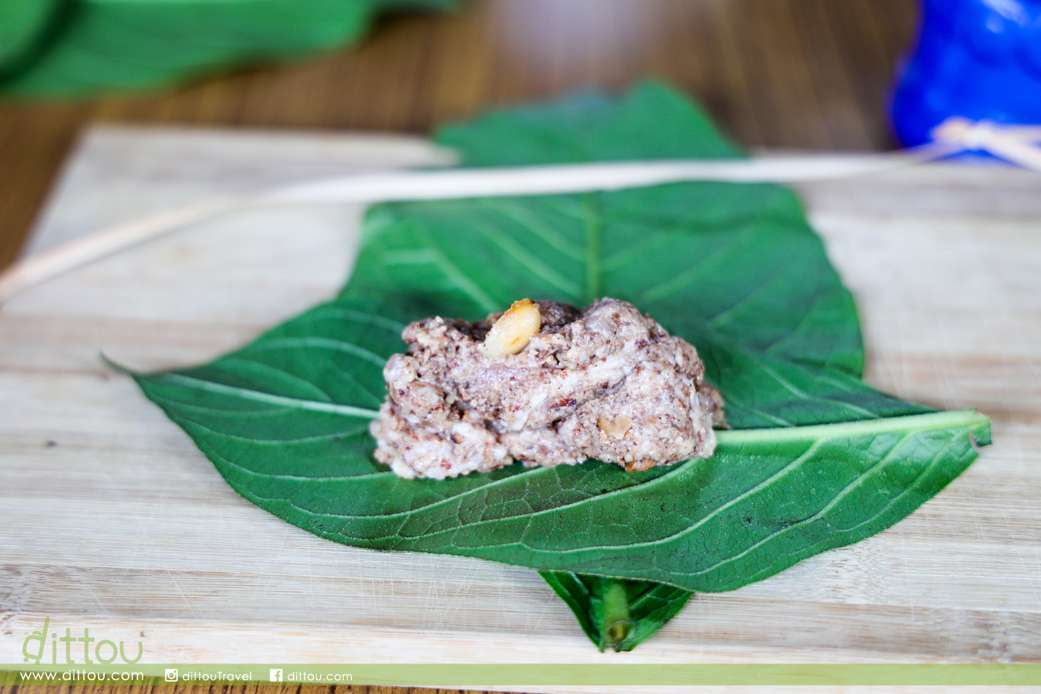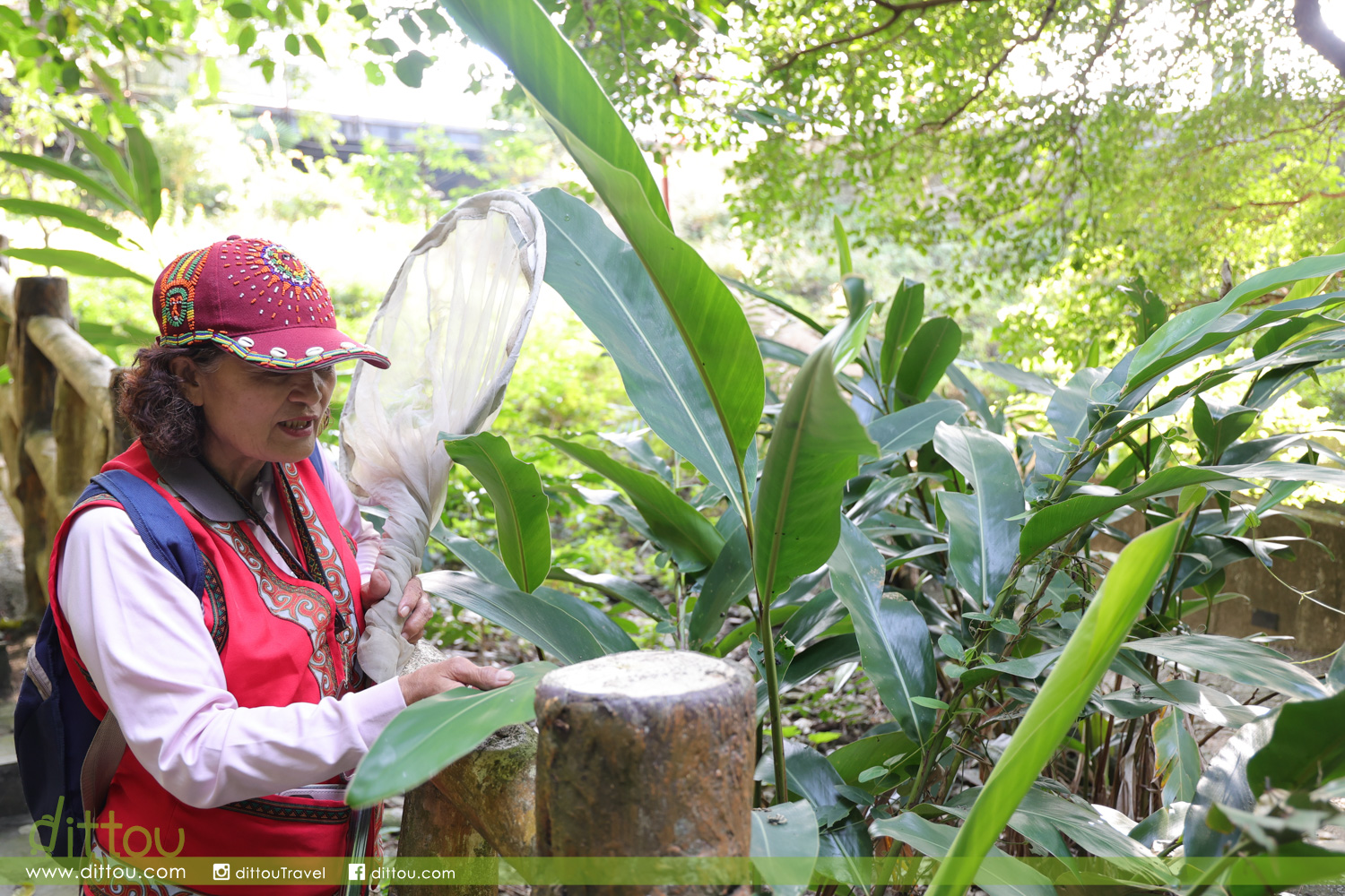 然後一起製作排灣族美食「吉拿富」。以假酸漿葉包裹芋頭與碎肉,再用月桃繩綑綁成長長的形狀。吃時把繩去掉連葉一起吃,葉片除了是可食用,亦是對腸胃很好可以促進消化,據說是從前獵人們上山狩獵時不可缺的食物。