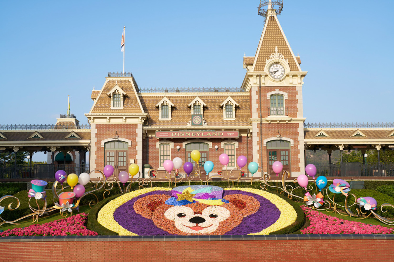 拍照焦點一、樂園入口花圃:Duffy花圃頭像換上20周年派對帽子造型
