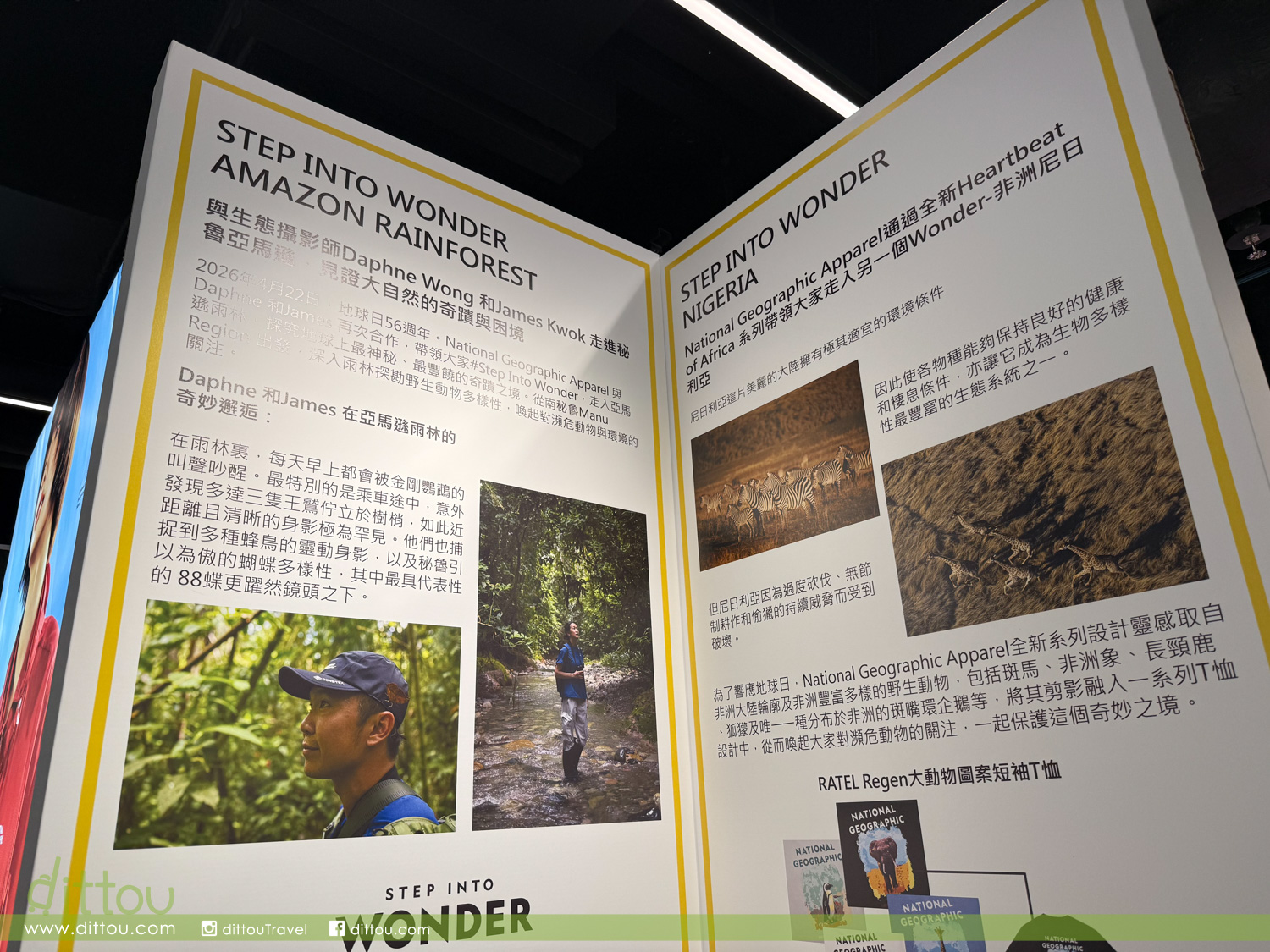 由即日起至5月3日,National Geographic Apparel 於沙田新城市廣場專門店呈獻全新主題展覽「Step Into Wonder」,透過亞馬遜雨林奇蹟之境及非洲動物的展覽內容與環保工作坊,帶領大眾深入探索自然。是次展覽再一次與生態攝影師 Daphne Wong 及 James Kwok 合作,帶領大家走進秘魯亞馬遜雨林,探索地球上最神秘且生物多樣性最豐富的地區之一。他們從南秘魯 Manu Region 出發,深入雨林腹地,見證不同野生物種的自然狀態與棲息環境。Daphne 與 James 於旅程中捕捉到多個難得畫面,包括極為罕見近距離出現的 King Vulture(王鷲)、多種蜂鳥的靈動姿態,以及秘魯標誌性的 88 蝴蝶。然而,在這些自然奇觀背後,雨林同時正面臨生態破壞與氣候變化所帶來的壓力,提醒大眾在欣賞之餘亦需正視保育的重要性。