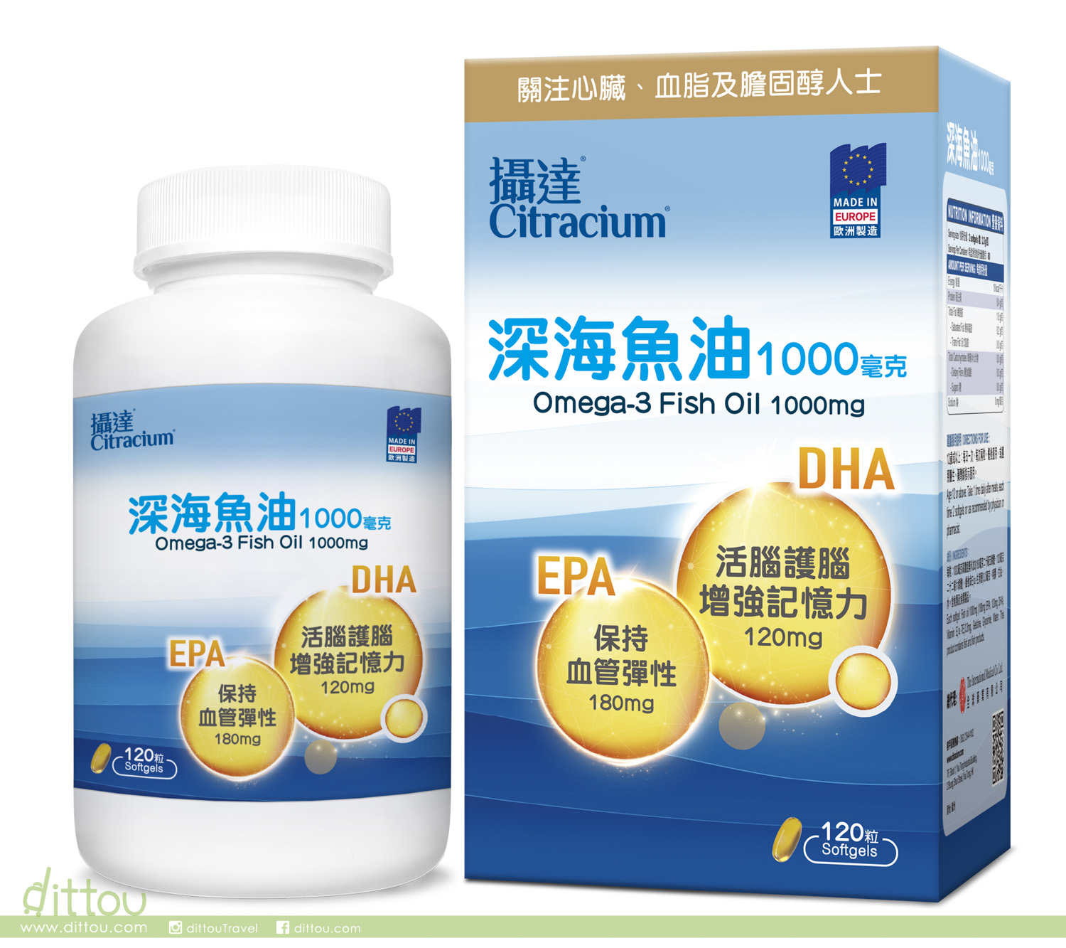 1000毫克高濃度奧米加3 ( 180毫克二十碳五烯酸,120毫克二十二碳六烯酸) , 維他命E (α-生育酚) 3.3 毫克