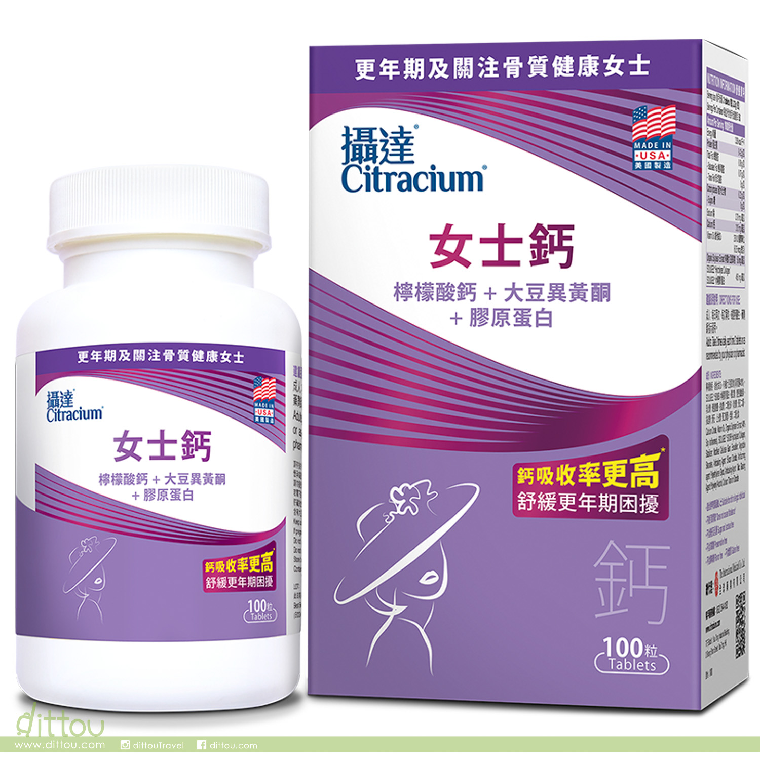 每兩片含315毫克鈣、250 IU維他命D3、20毫克大豆異黃酮(40%) 及 450毫克SOLUGEL膠原蛋白