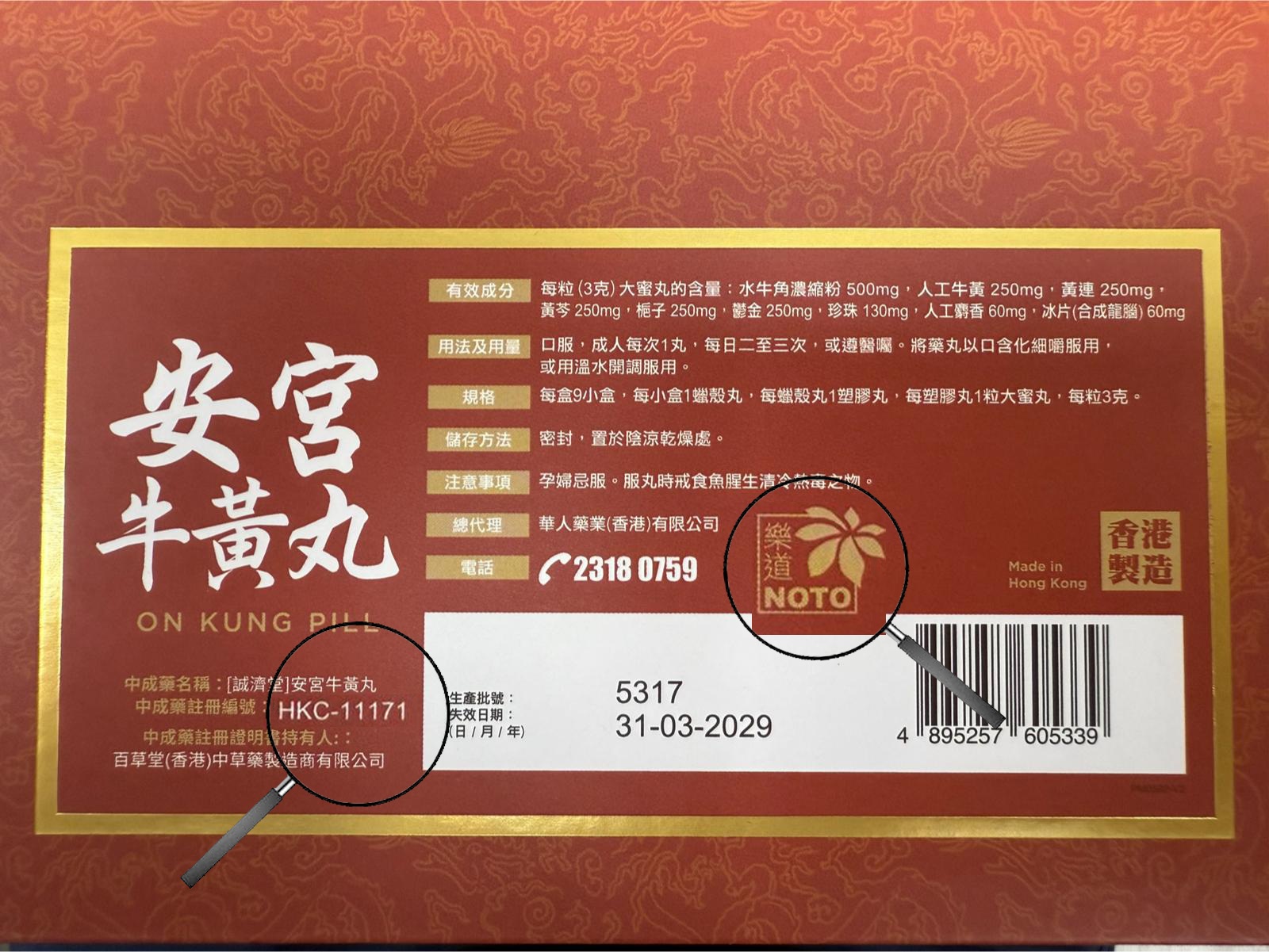 近年來,多宗報導揭露有生產商將安宮牛黃丸偽裝成食品形式出售,誤導消費者。市民購買時應注意藥盒上是否印有相關中成藥註冊編號,若一些包裝或名稱類似中成藥的產品如包裝上沒有中成藥註冊編號,亦即該產品並沒有通過中藥組對安全、品質及成效的評估。市民在選購時,應優先選擇信譽良好的品牌,並到可靠的連鎖零售商購買,確認產品具備中成藥註冊編號(HKC-XXXXX)或中成藥過渡性註冊編號(HKP-XXXXX)(其中「XXXXX」為五位數字組合)。