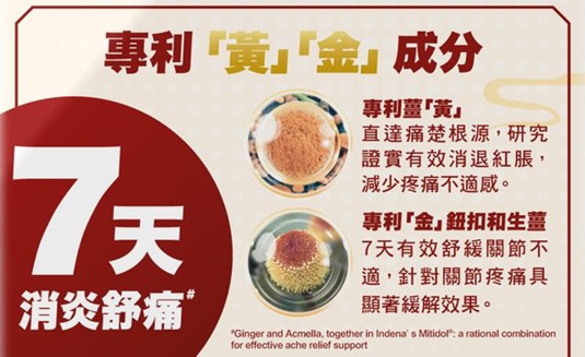 薈萃2大專利『黃』『金』成分: 專利薑『黃 』 直達痛楚根源,研究證實有效消紅退腫,減少疼痛不適感 專利『金』鈕扣 和生薑 亦有文獻指出,7天有效舒緩關節不適*,針對關節疼痛具顯 著緩解效果。