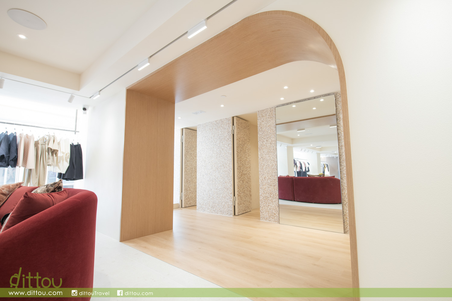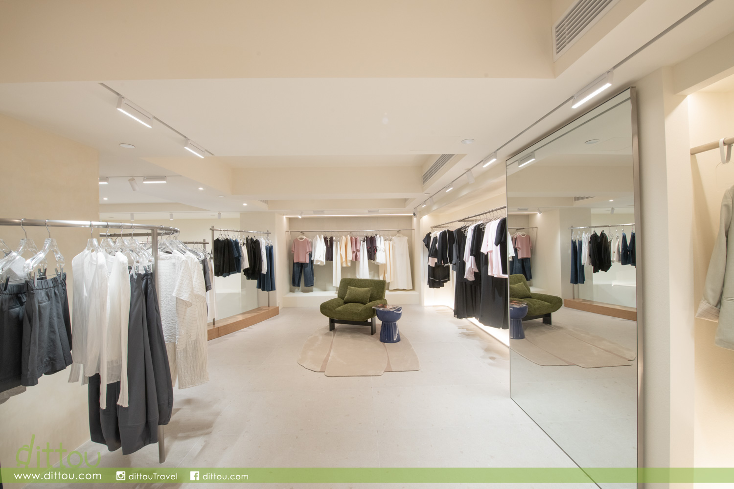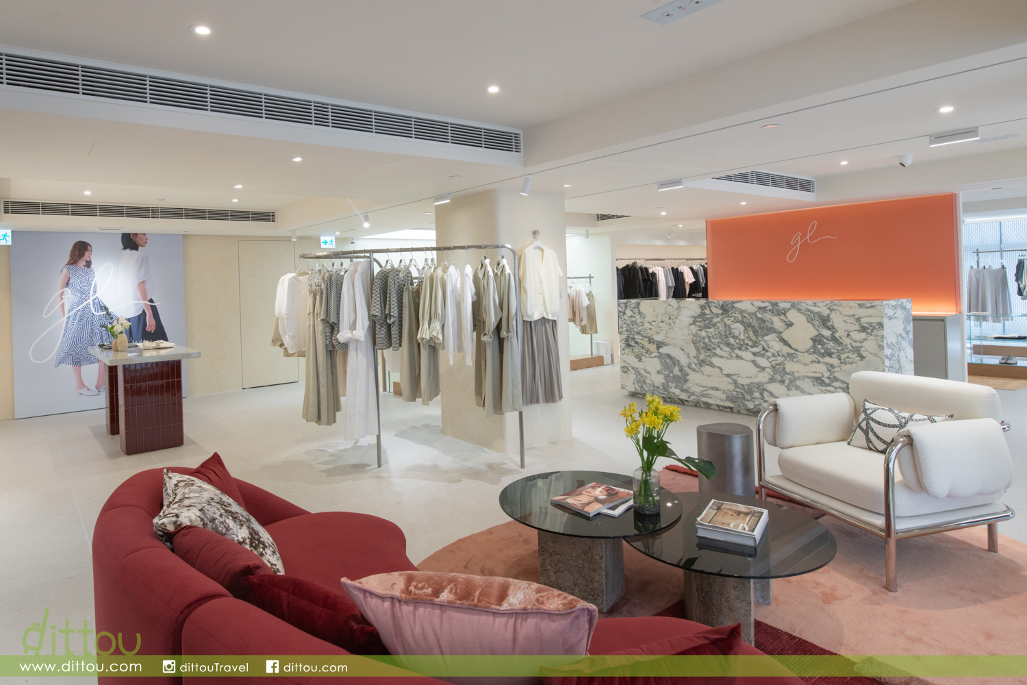 三層獨特空間各具魅力。地面樓層大面積運用鏡面元素,營造出節奏明快、充滿活力的時尚氛圍。中層閣樓引入綠與灰的精緻色調,輔以雕塑般的天然洞石陳列檯,展現鮮明的當代美學。頂層為三層中面積最大的一層,設有一面以珊瑚為靈感的貝殼主題牆,散發永恆的優雅與精緻品味。三個樓層各自呈現獨具匠心的空間體驗,店內核心位置另設有一面專題主題牆,展示 gl 品牌海報與理念,堅定傳達品牌賦能現代女性的承諾。秉持以客為本的傳統,全新翻修的試衣區域經過悉心擴展,同時保留 gl 標誌性的寬敞與舒適感,讓顧客能在愜意的環境中,享受完整的購物旅程。